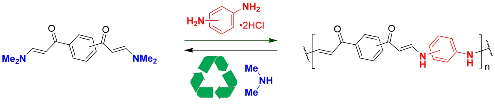 Transamination of bis-enaminones with 1,x-diamines were also found use in a mild amino–enaminone ‘click’ polymerisation method for the preparation of polyenaminones. The method allows for combinatorial preparation of structurally diverse polyenaminones. The obtained polymers were insoluble in most organic solvents, stable in diluted acids and bases, while degradable in concentrated hydrochloric acid at room temperature. They were thermally stable up to 200 °C and exhibited film-forming and UV-vis-shielding properties. Finally, we are particularly focused on the development of redox-active polyeneminones for the application in energy storage and conversion. Our aim and objectives in this field are the following: